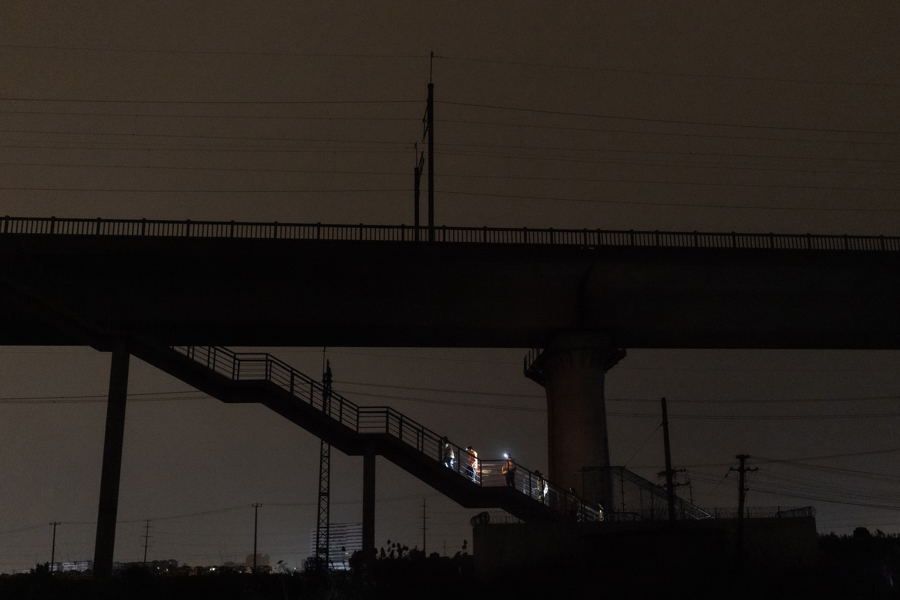 别称工东谈主在架设功课灯,为工友在黯澹的夜色中功课提供照明撑持。
