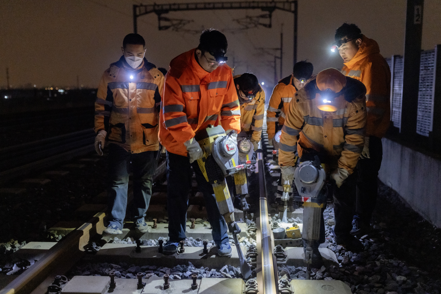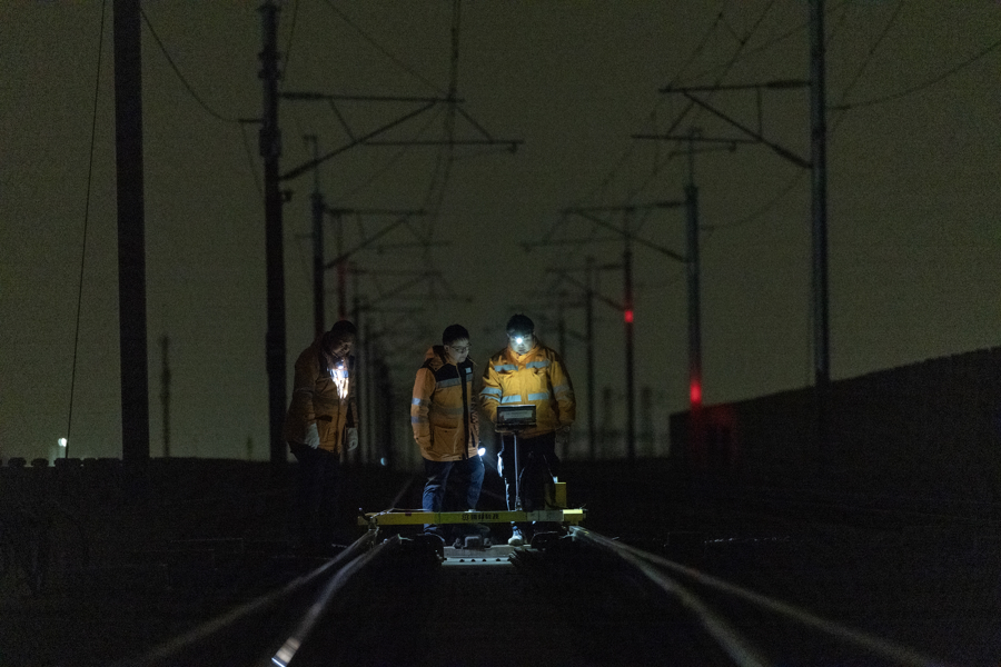 高铁露馅工们使用器具将存在问题的钢轨撬开,进行精密建树,保险高铁的安稳通行。