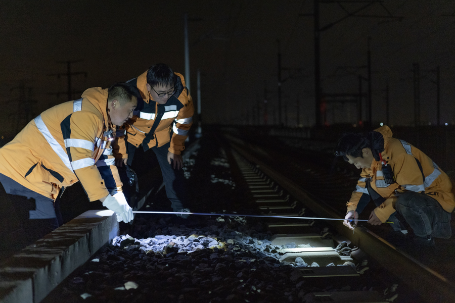 高铁露馅工在测量钢轨间距。