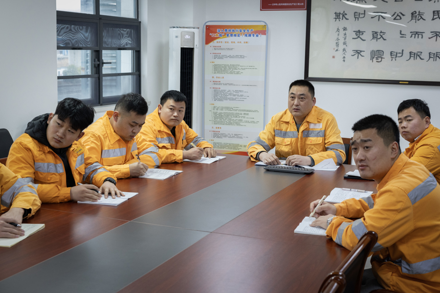 在功课初始前,工长袁浩协调工友进行开工前的动员。