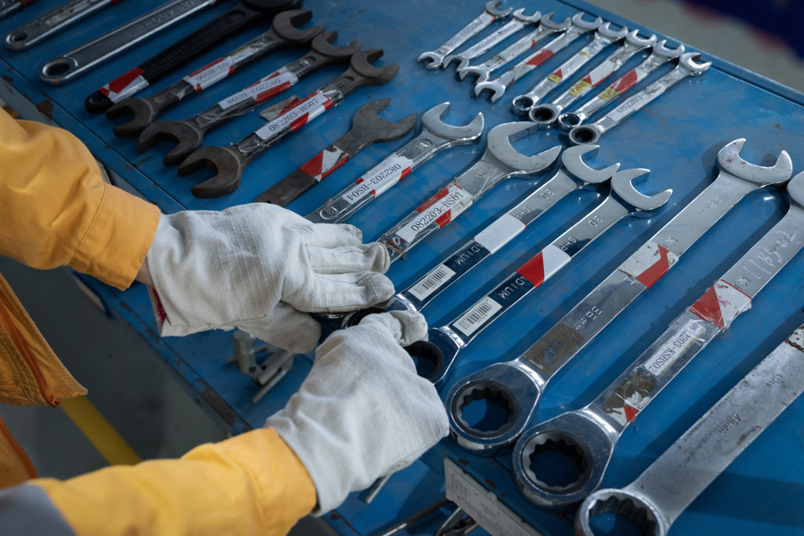 别称工东谈主在班组开发房中爱护盘点功课开发。