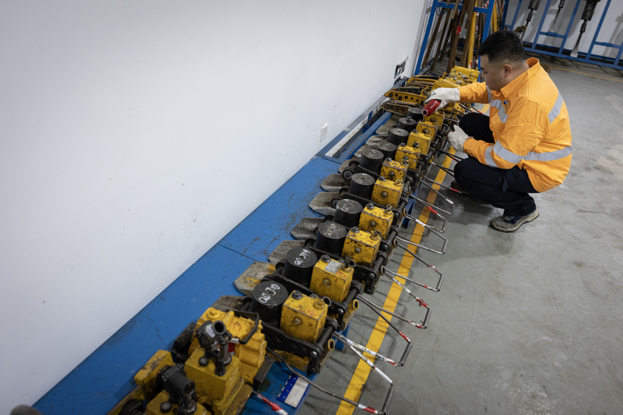 别称工东谈主在开发仓库中为液压起谈器加油。
