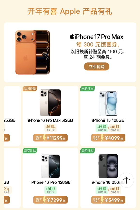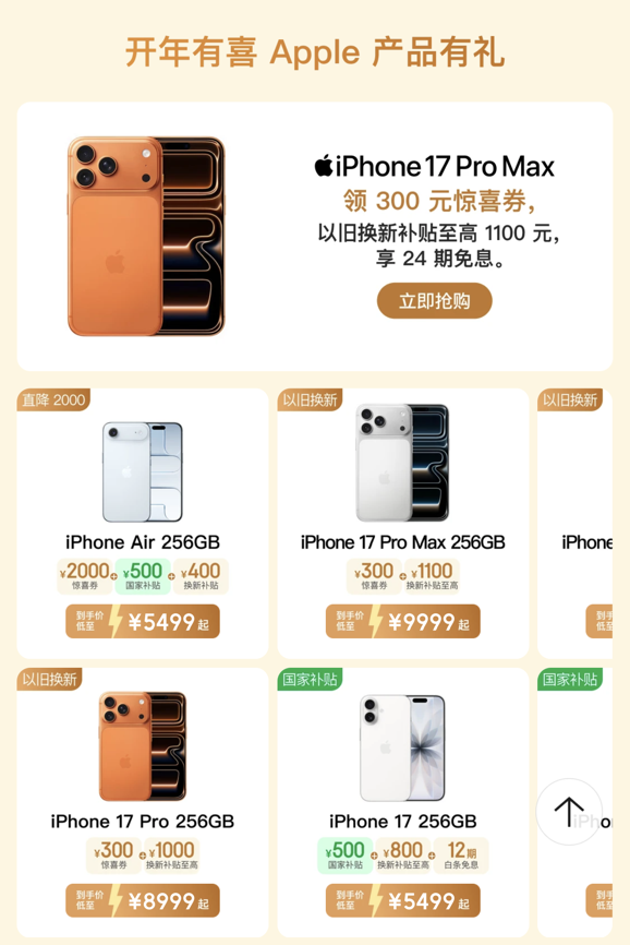 具体而言,iPhone 17系列可领500元国度补贴,加上至高800元的以旧换新补贴,256G版得手低至4699元起。iPhone 17 Pro系列可领300元惊喜券,可重叠1100元的以旧换新补贴,邀请好友不错多得100元以旧换新,至高优惠1500元还辅助12期免息,256G版得手低至7699元起;iPhone Air至高优惠3400元,256G版得手低至4599元起,还可享12期免息福利。