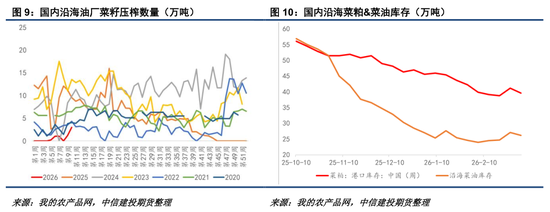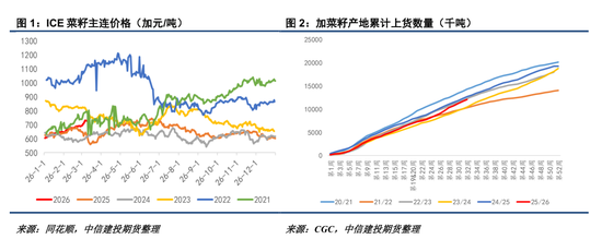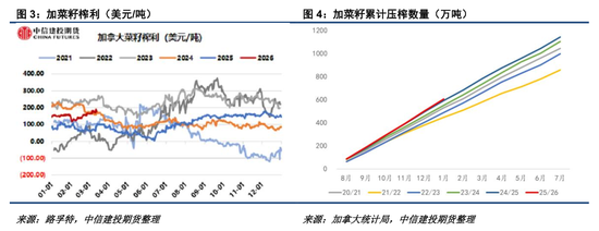 当今加菜籽25/26年度累计出口459万吨,达到历史同时的72%傍边,环比依然有所改善。咱们意会跟着中加菜籽采购的复原,加菜籽累计出口复原到24/25年度的80%以上概率较高,但当今想要达到AAFC预估的820万吨年度出口处所仍有难度。另一方面,加拿大压榨需求不时保管强健,截止到2026年1月25/26年度累计压榨达到605万吨,月压榨保管在100万吨以上,最终压榨达到1250万吨以上概率较高。咱们倾向于当今加菜籽相对偏高的估值水平主要受偏高的菜籽榨利复古,即好意思国菜油潜在入口需求复古着加菜籽,部分对消了加菜籽累计出口偏少的供应压力。