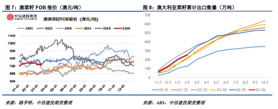 咱们意会澳大利亚是当今民众菜籽主要出口国当中压力最大的供应地。在中加菜籽采购复原之后,澳菜籽丧失了潜在的出口市集,而欧盟市集本作物年度入口总量预测唯一24/25年度的6成傍边,澳菜籽出口长进转淡。结果2026年2月,预测25/26年度澳菜籽累计出口252万吨,同比着落8万吨。在本作物年度澳菜籽增产100万吨以上的布景下,预测澳菜籽出口方式较为严峻。